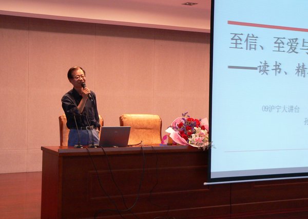 王主任介绍了孙慕义教授的简历和学术成果,对他们一行的到来表示热烈欢迎!在鲜花与掌声中,孙慕义教授结合生动的事例,深入浅出地讲解了读书对人生的启迪意义和对精神、文明的重要影响,阐释了深刻的生命伦理,引导大家共同思考“怎样去过一种好的人生”。会场气氛热烈,精彩的报告不时激起台下听众强烈的共鸣。