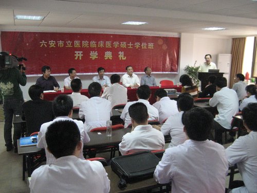 10月10日上午,我校在六安市立医院设立的临床医学硕士专业学位班开学典礼在市立医院隆重举行。校党委书记卞国忠应邀出席开学典礼。研究生部主任胡剑北、基础部主任张根葆、科研处副处长姚应水、研究生部老师郑兰荣和刘海荣及六安市立医院党政领导、六安市裕安区政府领导及全体学员参加开学典礼。会议由六安市立医院党委书记、院长李方军主持。六安市立医院执行院长夏祥厚致开幕词。