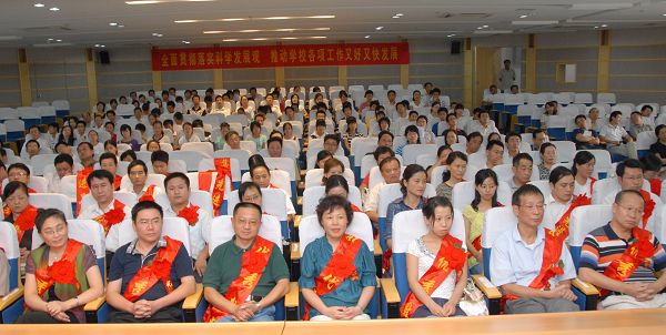 在雄壮的国歌声中,大会拉开帷幕。党委副书记、院长章尧致辞:他首先代表校党政向在教育教学第一线上辛勤耕耘的全体教师和为育人事业默默贡献的广大职工致以节日的问候!向在大会上受到表彰的先进集体和先进个人表示热烈的祝贺!向为学校事业发展做出贡献的离退休老同志致以崇高的敬意!祝全体教职医护员工节日快乐!接着指出,振兴民族的希望在教育,振兴教育的希望在学校,振兴学校的希望在教师。没有教师的无私奉献,默默耕耘,就没有学校的发展、教育的进步和民族的希望。章院长高度评价了我校在50年办学的风雨历程中所取得的令人瞩目的成就。在过去一年中,我校在学习实践科学发展观活动中各项工作取得了长足的进步,在治学、治教和育人工作中涌现出一批先进集体和先进个人。章院长号召广大教师和教育工作者要以他们为榜样,向他们学习,并对全校广大教师提出几点希望:要加强修养,提高素质,树立教师形象;要加强学习,转变观念,适应教学改革;要刻苦钻研,注重学养,提高业务水平;要加强合作,团结协作,注重团队意识。章院长最后强调,国运兴衰,系于教育,学校兴衰,在座有责。新学年,新起点,新希望,让我们以饱满的热情、求真的态度和务实的作风,人人为学校作一份贡献,学校的明天一定会更美好!