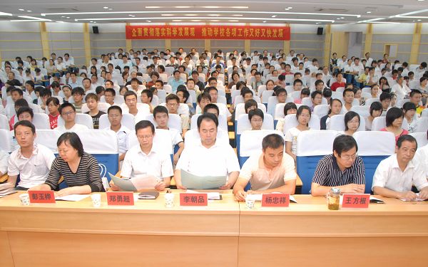 金秋送爽、丹桂飘香,9月10日下午,在全校教职员工欢度教师节之际,我校在南校区学术报告厅召开深入学习实践科学发展观活动总结大会。省属高校学习实践活动第一指导检查组组长丁伯华,副组长沙奇志、江贻东,成员彭玉桦、杨忠祥,联络员齐济友莅临会议指导。我校党委书记卞国忠,党委副书记、院长章尧,党委副书记郑勇超,副院长李朝品出席会议。全体教工党员及入党积极分子、民主党派负责人、部分学生党员及入党积极分子参加会议。会议由党委副书记、院长章尧主持。