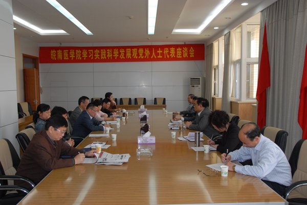 与会人员结合学校部门和个人实际,深情回顾了皖医50年来所取得的光荣成就。认为科学发展观的提出适应了时代的发展,它立足于我国国情,总结了改革开放和现代化建设的成功经验,吸取了世界各国发展进程中的经验教训,揭示经济社会发展的客观规律,反映了中国共产党对发展内涵的深刻理解和科学把握。高校党外人士学习实践科学发展观,首先要做好本职工作;其次要做好参政议政工作,双岗尽职,双岗立功。在提高自身素质上下功夫,在教学改革上有新突破,在科学研究上有大作为,在参政议政上有新举措。要围绕中心,服务大局,重视团结,维护稳定。选实题、知实情、说实话、做实事,准确反映社情民意,建有用之言、献务实之策、谋长远之道。与会人员还就皖医的科学发展问题提出了许多宝贵的意见和建议。