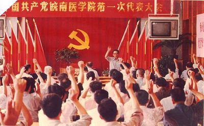 1974年,我校举办农村赤脚医生培训班。图为培训班结业典礼现场