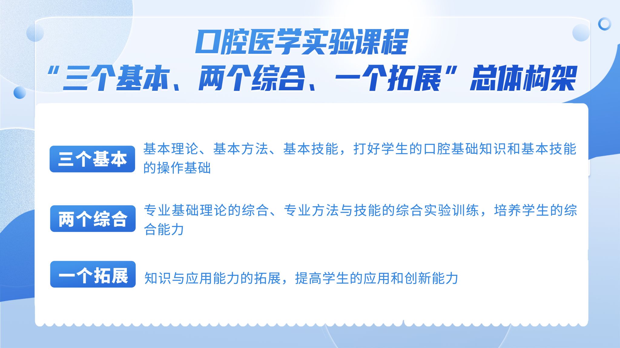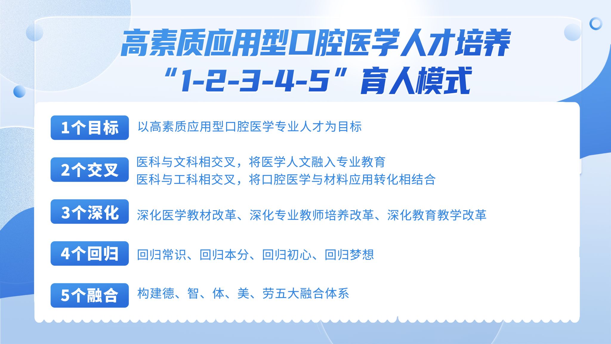 构建“12345”教育教学育人体系。1个目标:培养“理论扎实、技能精湛、医德高尚”的高素质应用型口腔医学人才。2个交叉:医学与工科交叉、医学与人文交叉。3个深化:深化医学教材改革、深化专业教师培养改革、深化教育教学改革。4个回归:回归常识、回归本分、回归初心、回归梦想。5个融合:构建德、智、体、美、劳五大融合体系。