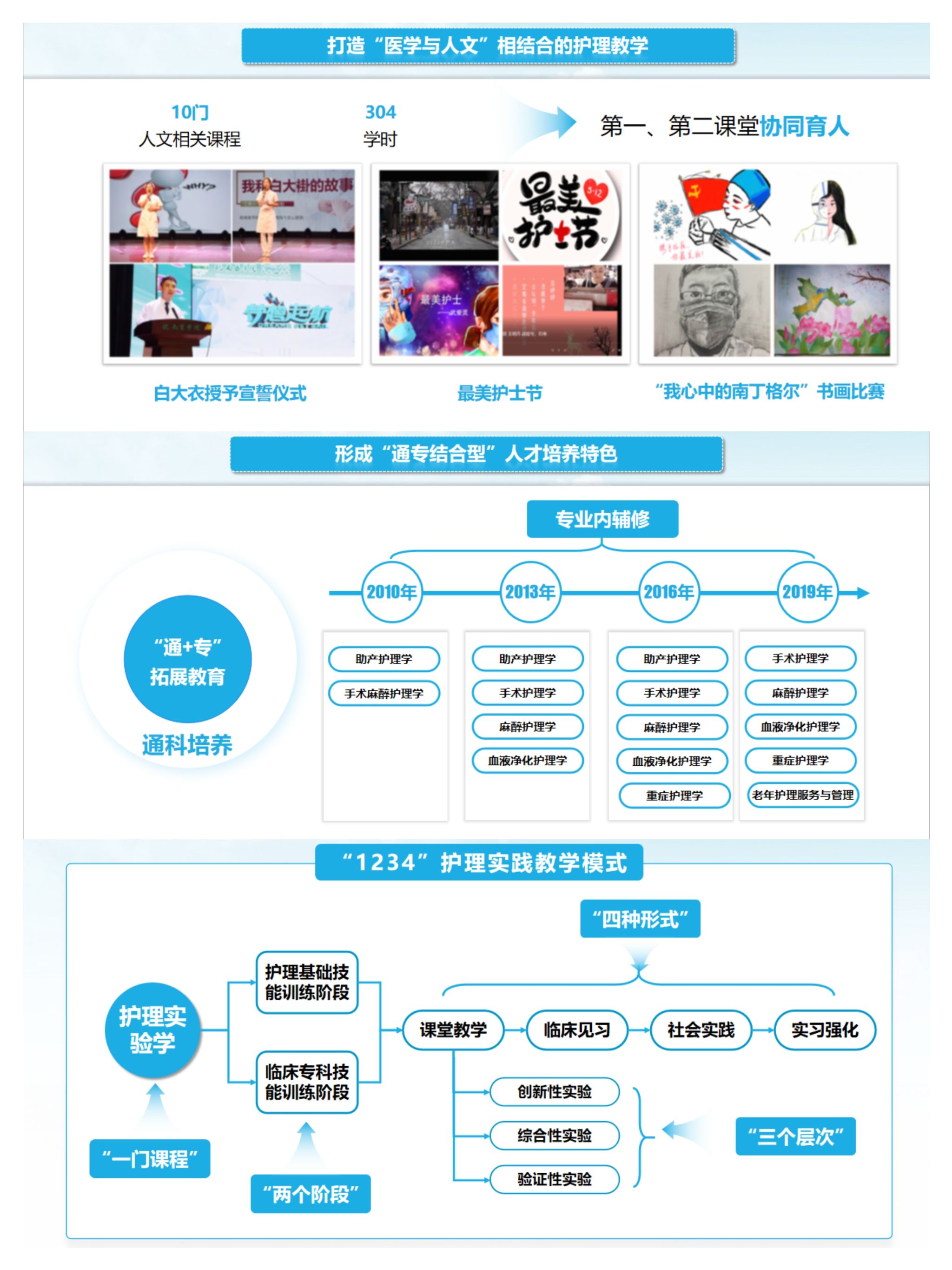 针对临床专科护理人才不足的问题,探索和建立“通专结合型”人才培养特色。针对学有余力的学生开设手术护理、血液净化护理、麻醉护理、重症护理、老年服务与管理等5个专科辅修模块课程,如《手术护理学》《血液净化护理学》《麻醉设备学》《麻醉护理学》《重症护理学》《管理学基础》《老年护理服务与管理》,涵盖理论与实验教学内容,培养学生临床专科护理能力。相关教学改革成果获校教学成果特等奖、省教学成果二等奖。