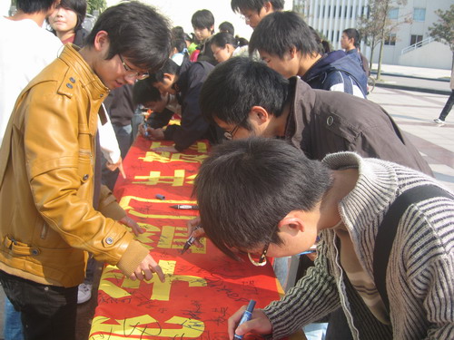 为庆祝我校50周年华诞,激发同学们爱校、荣校、兴校的情怀,11月2日上午,由医学一系2007级主办的校庆横幅签名活动在第一食堂门口隆重举行。