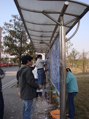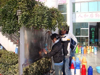 在快速有序的分组之后,由各小组组长带队,对全校的展板进行清理。大家用自带的盆、小刀、小铲子、抹布等清理工具,对脏兮兮的展板进行了 “地毯式”清理。清理持续了两个小时,整个清理过程中,没有抱怨、没有偷懒,有的,是认真,是热情,是配合。