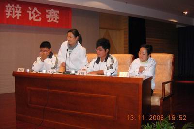辩论赛设主持一人,正、反方辩手各四人,均遴选自2007级和2008级法学专业学生。辩论赛的发言序位和发言时限,基本上参照了国际大专辩论赛的规则。在整场辩论赛过程中,主持人合理地控制了辩论节奏,双方辩手也充分地发挥了自己的才智,展现了自己的激情,在理智驳斥对方观点的同时,不懈地论证己方观点。随着辩论赛高潮的到来,狡黠的提问和笨拙的反击也在轮番上演,使得学生管理模式这一严肃的话题顿时变得轻松活泼起来。