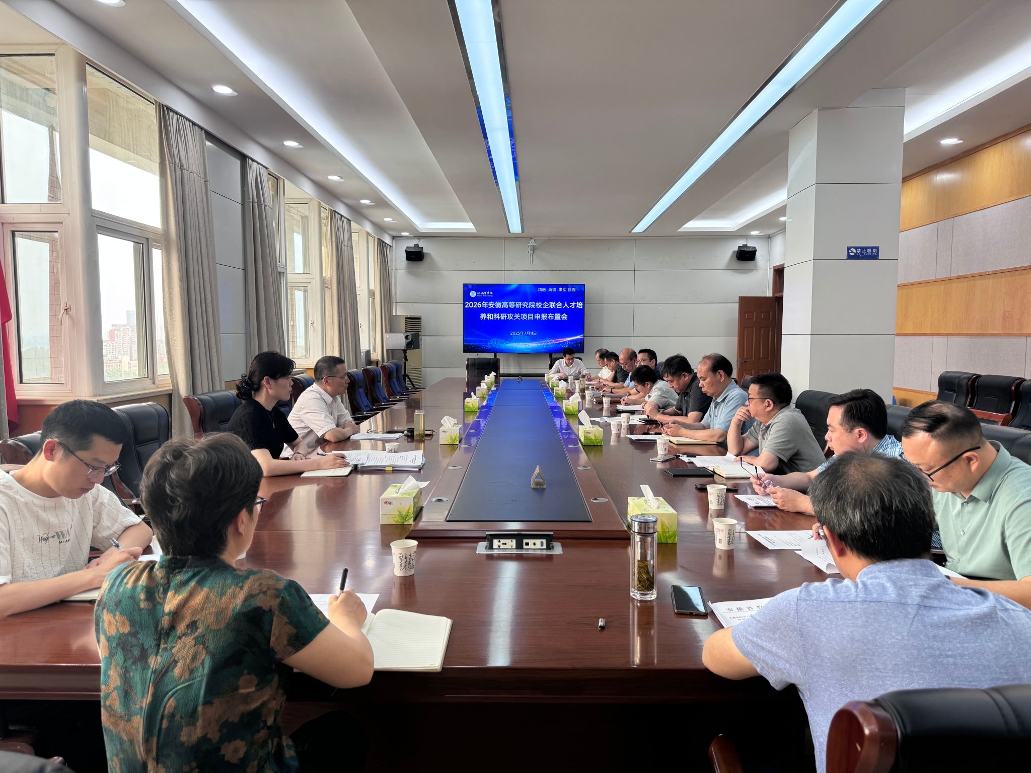 为进一步推进教育、科技、人才“三位一体”协同发展,深化产教融合、科教融合,7月11日,研究生学院组织召开2026年安徽高等研究院校企联合人才培养和科研攻关项目申报布置会。会议由研究生学院院长刘晓平主持。