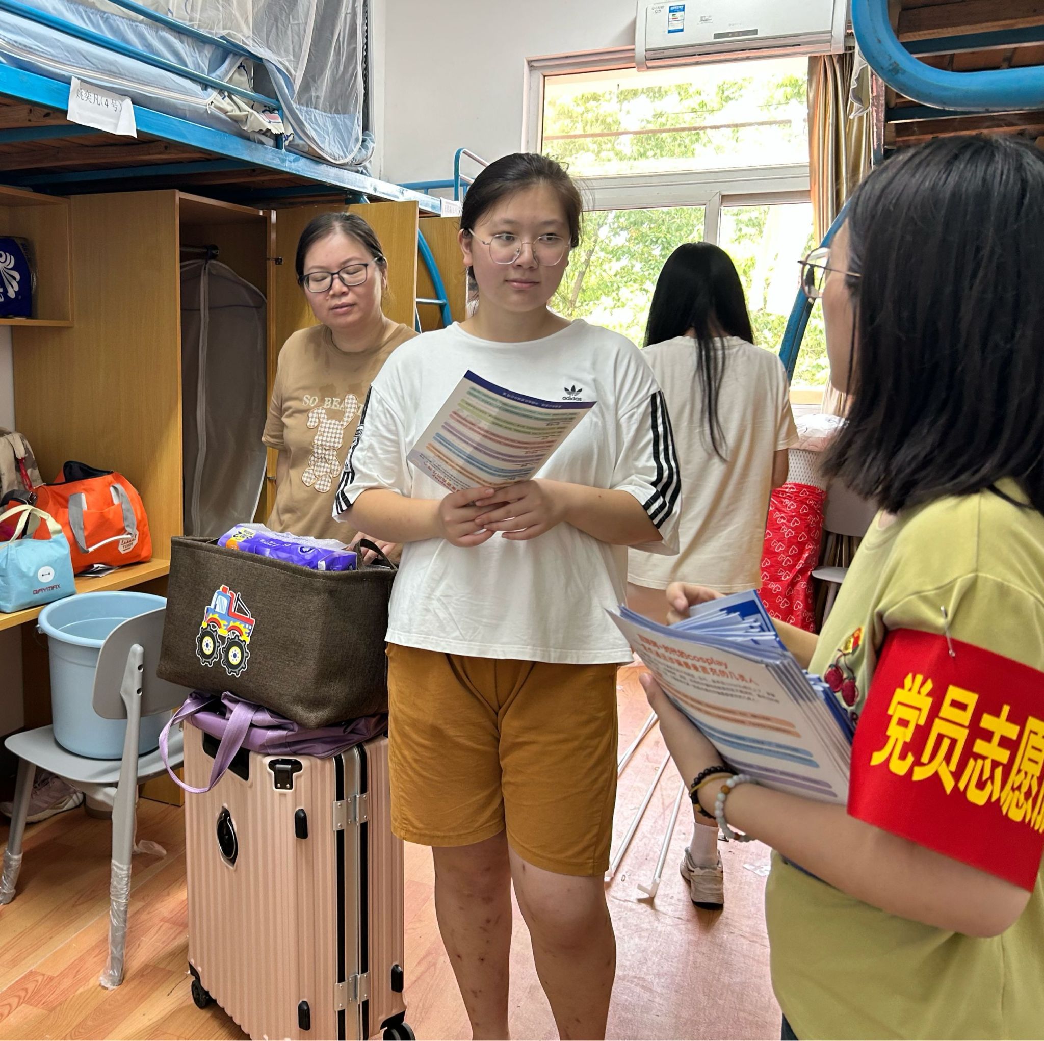 全心全意迎新生,全力以赴办实事。在迎新现场,还有一支由师生党员组成的志愿服务队。他们统一佩戴党徽,亮出党员身份,用心用情用力投身迎新工作中,开展交通疏导、防诈防推销宣传、新生引导咨询、行李搬运等工作任务。尤其迎新首日,由于校门口市政道路维修、校内停车空间有限,为避免自驾车辆拥堵,保证交通通畅,由教师党员组成的党员先锋队早早到达指定位置,配合保卫处耐心引导新生报到自驾车辆有序进校、安全停放、下卸行李、定向驶离。虽然穿着雨衣,但雨水和汗水却早已浸湿了他们的衣背。据统计,迎新期间,全校共设立党员服务站16个,成立党员服务队16个,有近600名师生党员参与迎新工作中,他们以实际行动擦亮了党员底色,让党旗在迎新一线高高飘扬,让党徽在迎新一线闪闪发光。