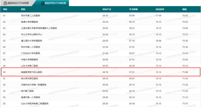 7月6日,中国医学科学院发布2022年度中国医院/医学院校科技量值(STEM)暨五年总科技量值(ASTEM),第一附属医院各有8个学科进入2022年度科技量值全国百强、五年总科技量值全国百强,入围学科数分别在全省医疗机构中排名第四和第三。
