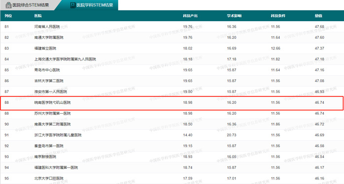 在五年总科技量值(ASTEM)排名榜单上,烧伤外科学排名全国第12名,神经外科学排名全国第32名,皮肤病学排名全国第42名,麻醉学排名全国第53名,变态反应学排名全国第63名,危重症医学排名全国第83名,急诊医学排名全国第98名。