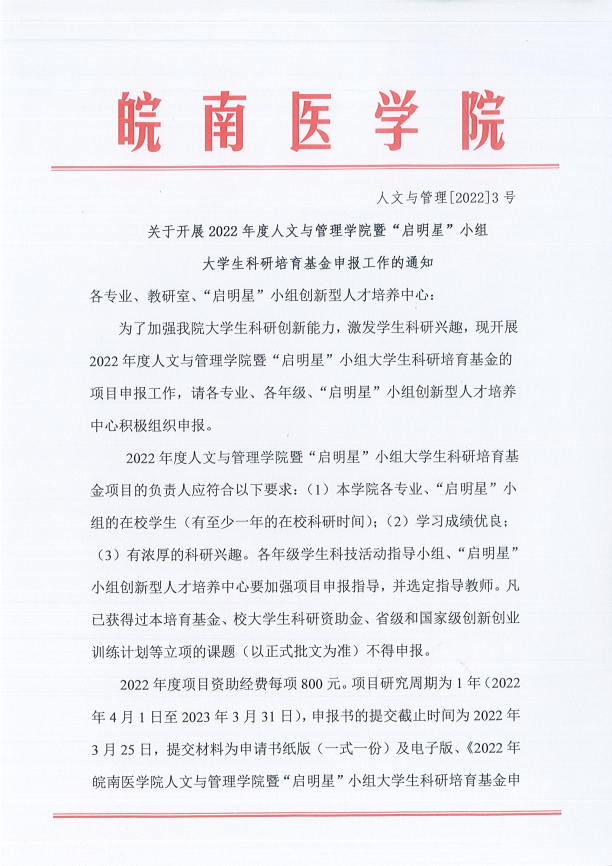 3月5日,《关于开展2022年度人文与管理学院暨“启明星”小组大学生科研培育基金申报工作的通知》(人文与管理〔2022〕3号)发布,新一期“启明星”小组成员一经建立自己的创新能力训练项目小组,即在指导教师的引导下,积极按照要求开展培育基金申报工作,共申报项目23项,成功获批21项。