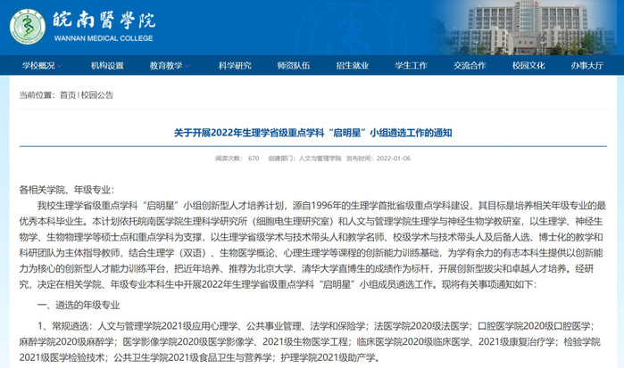 生理学省级重点学科“启明星”小组、人文与管理学院“启明星”小组创新型人才培养中心于1月5日在校园网发布《关于开展2022年生理学省级重点学科“启明星”小组遴选工作的通知》,按照高标准、高素质的条件要求,面向全校启动新成员遴选工作。在各方大力支持下,临床、麻醉、影像、法医、口腔、护理公卫、检验、人文与管理等学院14个专业的优秀学生经过自主申请、学院推荐、交叉推荐、培养中心面试、指导教师与学生双向选择等严格程序,最终有23人获得2022年度“启明星”小组成员资格,另有13人获得“2022年‘启明星’小组遴选入围奖”。