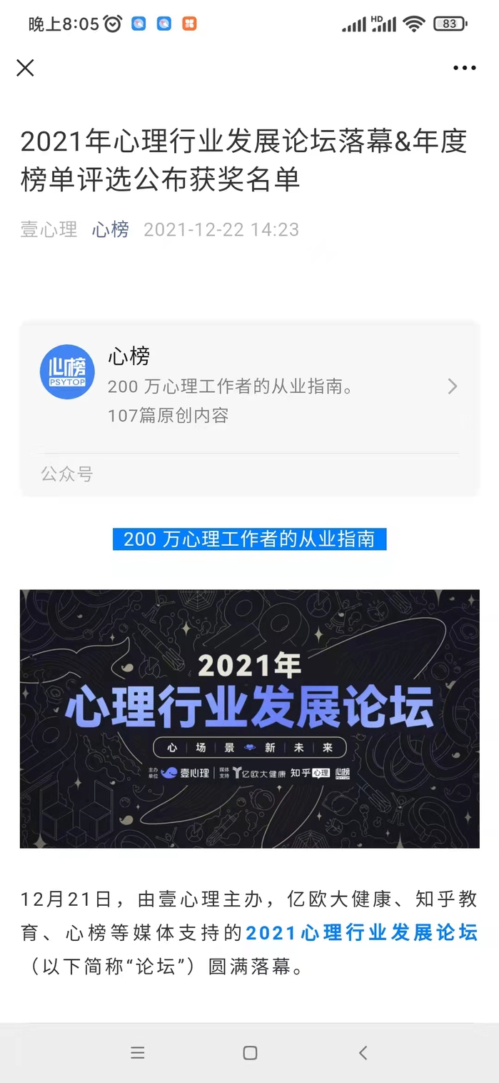 近日,国家级心理学专业平台“壹心理”主办的“迎新年心理行业发展论坛”圆满落幕。本次论坛以“心场景 新未来”为主题,以线上主题演讲、对话的形式展开,邀请行业内外众多领域的专家、学者、从业者以及来自教育、医疗、自媒体等相关领域知名人士与会,以心理学行业应用场景和从业者职业发展路径探索为主题进行热烈讨论,对心理学行业进行了多视角、多领域、深层次的解读与分享,对其未来发展提出了憧憬展望与建设性思路。论坛进行了综合性评选活动,我校人文与管理学院心理学教研室杭荣华教授基于在心理督导工作方面的优异表现,获评“十佳优质督导师”荣誉称号。