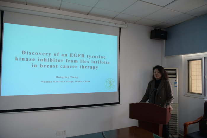 为培养学生科技创新意识,繁荣校园科技文化,营造科技创新氛围,2022年3月4日下午, 药学院邀请药理教研室王宏婷副教授作“Discovery of an EGFR tyrosine kinase inhibitor from Ilex latifolia in breast cancer therapy”专题讲座。药学院部分老师和研究生参加本次学术讲座。