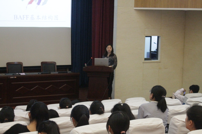 桂琳博士从自身课题的研究背景入题,概述了B淋巴细胞活化因子(BAFF)的产生、表达、结构及其主要生物功能,重点介绍了BAFF发挥生物功能的信号通路,并结合自己的研究工作,围绕其信号通路提出问题与研究假设,阐述了Ca2+信号在hsBAFF促B淋巴细胞增殖中的分子机制。整个报告层层深入、思路缜密、语言平实、通俗易懂,参会师生获益良多。