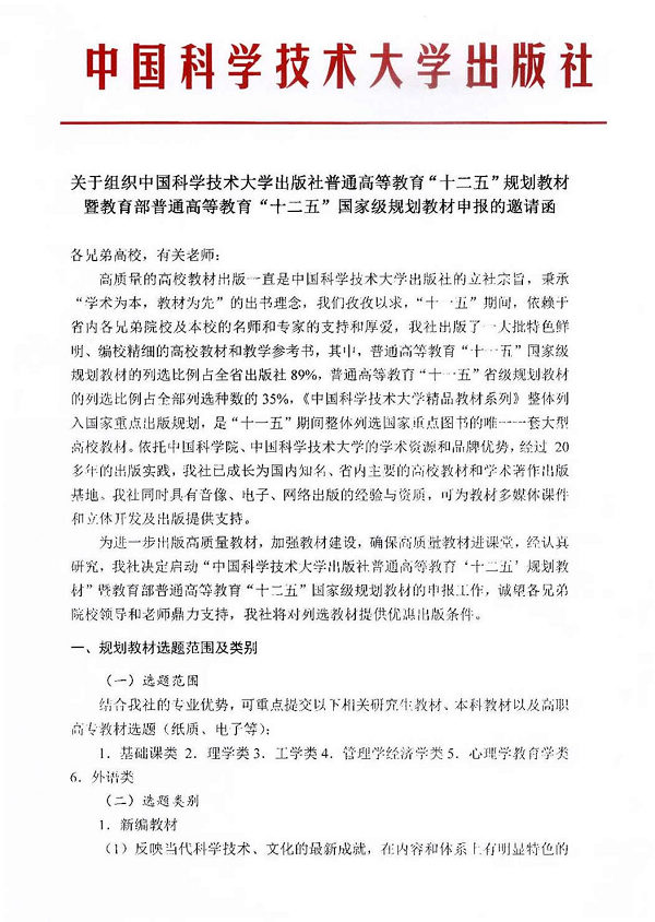 现将中国科大出版社《关于组织中国科学技术大学出版社普通高等教育“十二五”规划教材暨教育部普通高等教育“十二五”国家级规划教材申报的邀请函》及《中国科学技术大学出版社“十二五”规划教材选题申请表》转发给你们,请各教学单位结合实际工作需要,对照规划教材选题范围及类别积极组织申报。