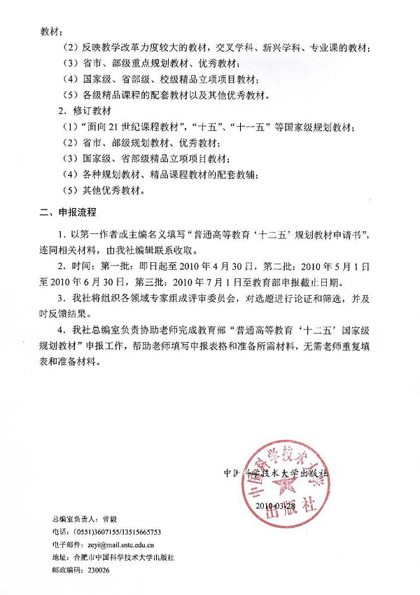 申报流程:下载《中国科学技术大学出版社“十二五”规划教材选题申请表》填写后于4月28日至6月30日将电子版发送教材科(jck@ wnmc.9weile.com,联系人:刘力华 电话:3932631)